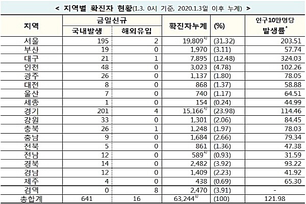 한편, 질병관리청 중앙방역대책본부는 3일 0시 기준으로 국내 발생 신규 확진자는 641명이 확인되었고, 해외유입 사례는 16명이 확인되어 총 누적 확진자 수는 63,244명(해외유입 5,462명)이라고 밝혔다. 1월 3일(0시 기준) 국내 주요 발생 현황은 다음과 같다.