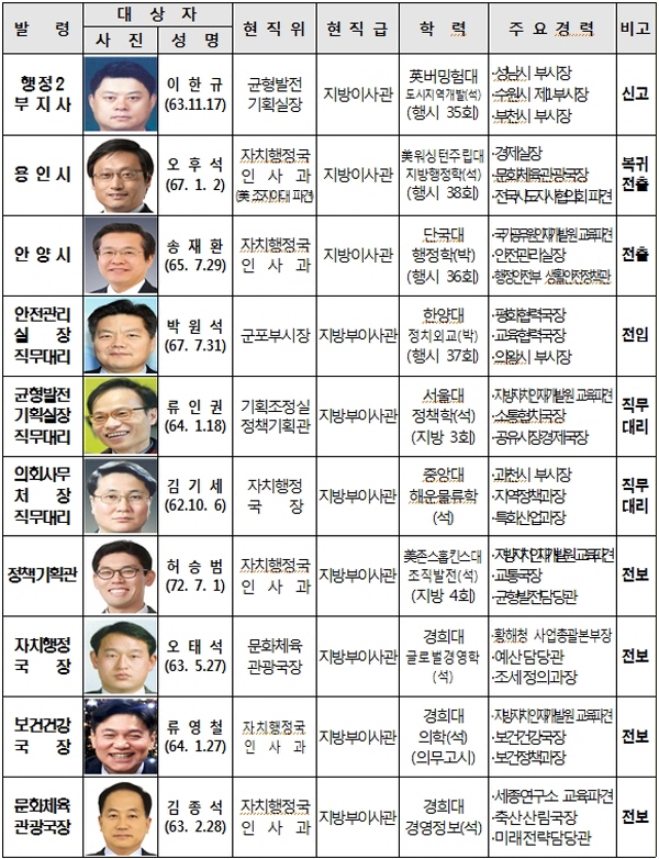 승진은 2급 3명, 3급 7명 등 10명이며, 이와 별도로 4급 부단체장으로 3명이 자리를 옮긴다. 특히 3급 국장급인 인재개발원장에 코로나19 현장에서 묵묵히 소임을 다한 윤덕희 질병정책과장을 발탁하는 한편, 보건건강국장에 전문 의료인 출신인 류영철 국장을 임명해 코로나19 대응과 위기극복의 중임을 맡겼다.