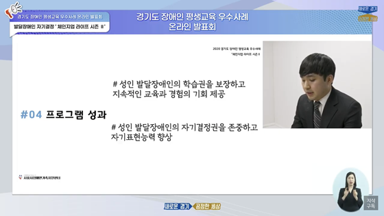 지난 28일 진행된 경기도 장애인 평생교육 우수사례 온라인 발표회 캡쳐 사진. ⓒ시흥시장애인가족지원센터 에이블포토로 보기▲ 지난 28일 진행된 경기도 장애인 평생교육 우수사례 온라인 발표회 캡쳐 사진. ⓒ시흥시장애인가족지원센터시흥시장애인가족지원센터(센터장 한은애)가 '2020년도 경기도 장애인 평생교육 우수사례 공모사업' 우수상을 수상했다고 31일 밝혔다.