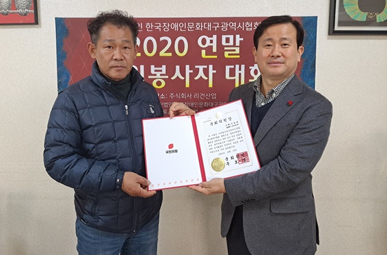 한국장애인문화대구광역시협회는 지난 29일 (주)리건산업 사무실에서 장애인예술인활동을 응원하고 장애 인식 개선 운동에 적극 참여한 봉사자에게 감사를 전달하는 ‘2020 대구장애인예술 발전을 위한 연말 자원봉사자 대회’를 개최했다. ⓒ한국장애인문화대구광역시협회