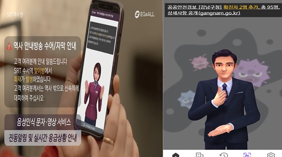응급 상황 실시간 수어 영상 안내서비스는 청각장애인을 위한 스마트폰 공용 앱(수어통)을 통해 다중이용시설에서의 응급 안내방송, 시설 내 필수 안내 표지문 및 스마트폰에서 수신한 재난문자 내용을 실시간으로 수어 영상을 통해 제공한다.