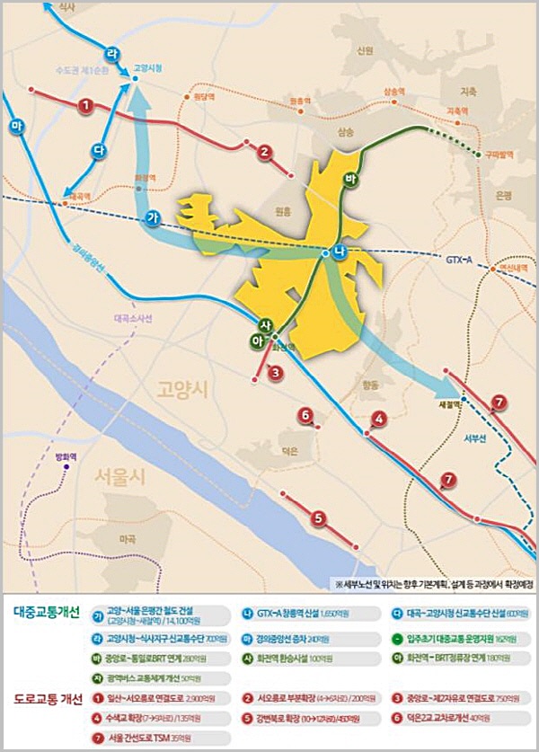 버스 대중교통을 이용해 고양시 인근 도심지를 쉽고 빠르게 접근할 수 있도록 사업지 남북에 위치한 중앙로 및 통일로 BRT 연계를 위한 사업지구 내 버스전용차로를 설치(지도㉳) 할 예정이다. 아울러 출퇴근시간대 광역버스 등 대중교통의 서울 도심 이동시간을 대폭 절감할 수 있도록 광역버스 교통체계개선 사업(지도㉶)도 반영하였다.
