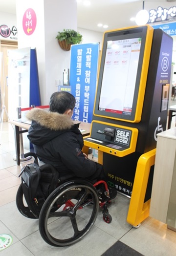 우창윤 한국유니버설디자인협회 회장이 영동선 인천방향 여주휴게소 푸드코트에 설치된 배리어프리 키오스크를 직접 이용해 보고 있다. ⓒ박종태 에이블포토로 보기▲ 우창윤 한국유니버설디자인협회 회장이 영동선 인천방향 여주휴게소 푸드코트에 설치된 배리어프리 키오스크를 직접 이용해 보고 있다. ⓒ박종태휠체어를 사용하는 우창윤 한국유니버설디자인협회 회장은 키오스크를 직접 이용해 본 뒤 “높이가 조절되고 밑에 휠체어가 들어갈 공간이 있어 주문하는데 어려움이 없다”고 말했다.