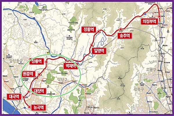 시는 이와 관련 현재의 교외선 노선으론 지역여건 변화에 따른 통행유형 변화로 이용률이 현저히 떨어져 추진 실익이 없다고 주장하고 있는데, 기존 교외선 노선인 원릉역(사진 출처 두산백과)은 3호선 원당역과 예정인 고양시청역과 가까워 1시간 간격으로 운행되는 교외선을 이용하는 사람은 의정부 수요뿐이고 벽제역 인근은 그린벨트로 군부대가 많아 교통수요 창출이 어려울 것으로 보고 있다.