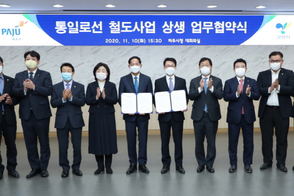 협약내용은 고양시와 파주시가 통일로선(삼송~금촌) 노선에 대해 ‘제4차 국가철도망 구축계획’ 반영을 위해 양 지자체 상호간 협력체계를 구축해 향후 효율적 사업추진에 적극 대응한다는 내용이다.