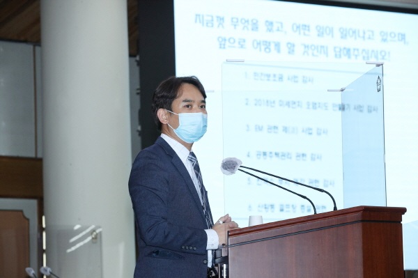 또 생태하천과 EM 배양기 구매계약 관련 특정감사와 관련해서 감사관은 “2019년과 2020년 EM 배양기 제작·구매계약의 적정성 여부, 계약 해지 가능 여부 및 법률자문 의도성, 낙찰업체의 과업 수행능력에 대해서도 하자가 있는 건지 검토하였고 그런 내용을 담아서 감사결과에 반영하였다”며 “이 건도 마찬가지로 현재 감사 종결이 되지 않았기 때문에 감사종결 후 보고하겠다”고 말했다.