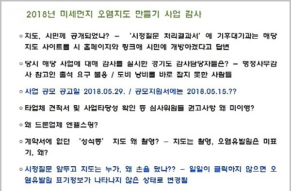 이에 전희정 감사관은 “2018년 미세먼지 오염지도 만들기 사업 특정감사를 실시하면서 해당 사업의 보조사업 선정과 사업계획서의 적정여부, 정산검사, 보조사업 결과물인 오염지도의 활용과 관리실태의 적정여부 등에 대해서 중점적으로 검토 확인하였다”며 “그러나 이 감사는 종료되었는데 최종 감사 확정을 짓지 않은 상태로, 며칠 사이에 결론이 날 것이기에 그 감사 결과를 보고하겠다”고 답변했다.