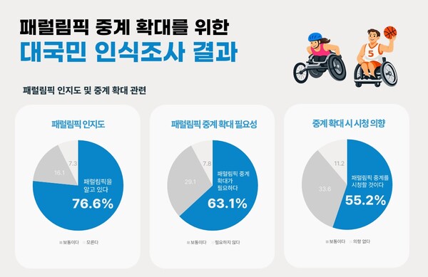 조사 결과 국민 10명 중 7명(76.6%)은 이미 패럴림픽을 인지하고 있는 것으로 나타났으며 패럴림픽 중계 확대가 필요하다는 응답은 63.1%에 달했다. 또한 중계 환경이 개선될 경우 실제로 시청할 의향이 있다는 응답은 55.2%로 과반을 차지했다.