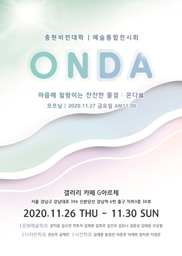 이번 ‘ONDA 展’은 세 번째 진행되는 전시회로 충현비전대학 문화예술학과 10인(강지윤, 김수연, 연호석, 김재원, 김희주, 김건우, 김유나, 김윤상, 김태윤, 신상철), 디자인학과 2인(권순우, 금채민), 사진학과 6인(김재훈, 윤정민, 이준호, 이재희, 정지원, 지정은) 총 18인의 작품 40여 점이 전시된다.