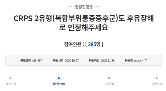 청원인은 “현재 경제생활을 못 하는 것은 물론이고 재택근무를 할 수 있는 환경도 코로나로 어려워진 탓인지 구하기 어렵다”며, “장애인으로 등록이 되더라도 CRPS 환자들은 통증에 대한 사항을 인정받지 못해 배정받는 순위도 뒷순위일 뿐만 아니라 아직은 장애등록조차 어려운 상황”이라고 토로했다.