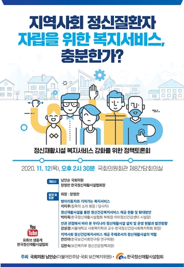 ‘지역사회 정신질환자 자립을 위한 복지서비스, 충분한가?’ 정정책토론회 포스터. ⓒ남인순 의원실 에이블포토로 보기▲ ‘지역사회 정신질환자 자립을 위한 복지서비스, 충분한가?’ 정정책토론회 포스터. ⓒ남인순 의원실더불어민주당 남인순 의원(보건복지위원)이 오는 12일 국회의원회관 제8간담회의실에서 한국정신재활시설협회(회장 장명찬)와 함께 ‘지역사회 정신질환자 자립을 위한 복지서비스, 충분한가?’ 정신재활시설 복지서비스 강화를 위한 정책토론회를 개최한다.