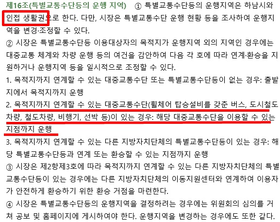 하남시 특별교통수단 등의 운영에 관한 조례 내용.ⓒ하남시의회 에이블포토로 보기▲ 하남시 특별교통수단 등의 운영에 관한 조례 내용.ⓒ하남시의회현재 ‘하남시 특별교통수단 등의 운영에 관한 조례’ 제16조에 따르면, 특별교통수단의 운행지역은 하남시와 인접 생활권으로 하고 있으며, 목적지가 운행지역 외의 지역인 경우에는 대중교통 체계와 차량 운행 등의 여건을 감안해 조정 가능하다.