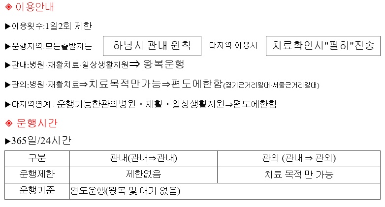 하남시 장애인콜택시 이용기준. 관외는 치료 목적 외에는 불가능하다.ⓒ하남시교통약자이동지원센터 홈페이지 에이블포토로 보기▲ 하남시 장애인콜택시 이용기준. 관외는 치료 목적 외에는 불가능하다.ⓒ하남시교통약자이동지원센터 홈페이지이에 A씨는 하남시에서 운영하는 장애인콜택시(나눔콜) 콜센터에 문의했지만, 원칙적으로 하남시 안에서만 이용할 수 있고, 병원 목적 이외의 사유로는 서울 혹은 인근지역까지 이용할 수 없었다.
