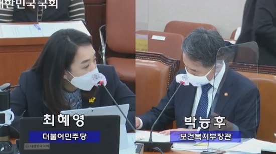 ▲ (왼)더불어민주당 최혜영 의원(오)보건복지부 박능후 장관.ⓒ국회방송 캡쳐 관련기사- 이종성 “장애감수성 없는 태도” 호통