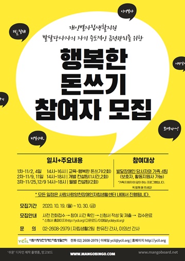 ▲ 사람사랑양천장애인자립생활센터가 발달장애인 당사자와 가족 대상 금전관리 컨설팅 ‘행복한 돈쓰기’ 프로그램 참여자를 오는 30일까지 모집한다.ⓒ사람사랑양천장애인자립생활센터 사람사랑양천장애인자립생활센터가 발달장애인 당사자와 가족 대상 금전관리 컨설팅 ‘행복한 돈쓰기’ 프로그램 참여자를 오는 30일까지 모집한다.