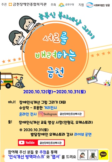 아울러 장애인식개선 그림 그리기 대회 수상작을 볼 수 있는 ‘조용한 거리전시’를 금천장애인종합복지관, 금나래 중앙공원, 독산역 1번 출구 앞, 가산디지털단지역 1호선에 전시한다.