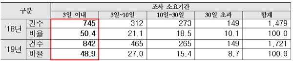 3일 이상 경과 후 조사 현황을 보면 3일~10일이 465건(27%), 10일~30일 265건(15.4%), 30일 초과가 149건(8.7%)로 나타나 사건 접수 후 신속한 조사가 이루어지지 않는 것으로 확인됐다.
