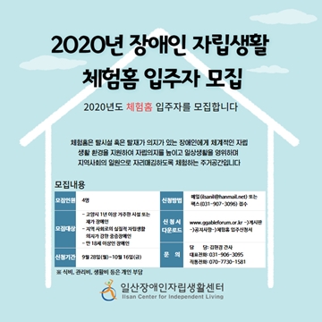 ▲ 2020 장애인 자립생활 체험홈 입주자 모집 포스터. ⓒ일산장애인자립생활센터 일산장애인자립생활센터(대표 안미선)가 오는 10월 16일까지 자립 의지가 강하고 자립 생활에 관심이 있는 고양시 내 시설 및 재가 장애인을 대상으로 체험홈 입주자를 모집한다.