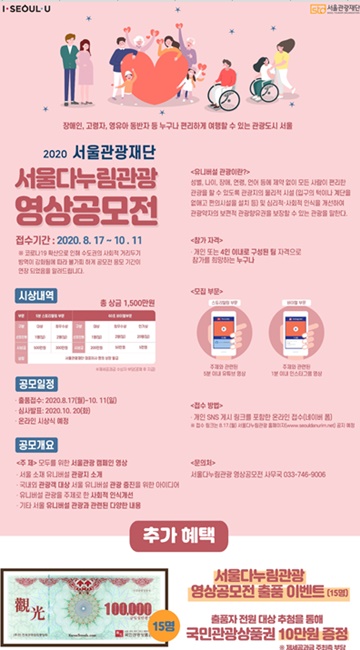 ▲ 서울다누림관광 영상 공모전 2차 홍보 포스터.ⓒ서울관광재단 서울시와 서울관광재단이 장애인, 고령자, 영유아 동반자 등 관광약자를 위한 유니버설(무장애) 관광 콘텐츠 발굴 및 인식 제고를 위해 개최하는 서울다누림관광 영상 공모전 접수 기간을 10월 11일까지 연장한다.