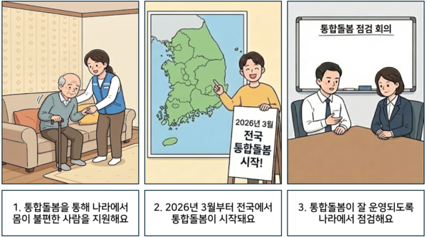 1 통합돌봄을 통해 나라에서 몸이 불편한 사람을 지원해요. 2 2026년 3월부터 전국에서 통합돌봄이 시작돼요. 3 통합돌봄이 잘 운영되도록 나라에서 점검해요. ©AI 편집실