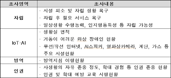 전수조사는 ▲자립 욕구 및 가능성, ▲IoT·AI 환경, ▲방역실태, ▲인권실태의 4가지 영역에 대해 51∼55개 문항을 조사하게 된다.