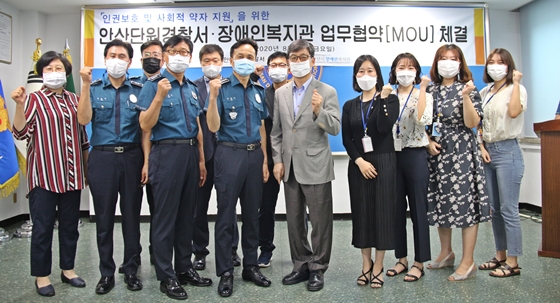 ▲ 안산시장애인복지관이 지난 14일 안산단원경찰서와 보완대체의사소통 그림, 글자판 활용과 보급을 위한 업무협약을 체결했다. ⓒ안산시장애인복지관 안산시장애인복지관이 지난 14일 안산단원경찰서와 보완대체의사소통(Augmentative and Alternative Communication, 이하 AAC) 그림, 글자판 활용과 보급을 위한 업무협약을 체결했다.