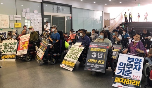 전장연은 “코로나19 때문에 집단적 수용시설의 정신병원과 장애인거주시설에서 사람이 죽어갔다. 코로나19 때문에 가장 많이 피해를 보고 죽어간 사람들이 사회적 취약계층”이라면서 “말로만 ‘지역사회 통합과 참여’를 외치고, 예산과 정책은 후퇴시켰다”고 지적했다.