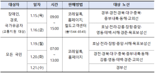 먼저 15일과 16일에는 ▲고령자 ▲장애인 ▲국가유공자 등 교통약자 대상 사전 예매가 진행된다.