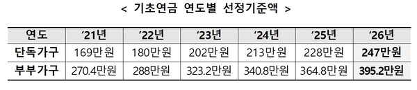 【에이블뉴스 권중훈 기자】 보건복지부(장관 정은경)는 ‘2026년도 기초연금 선정기준액’을 단독가구 월 247만 원, 부부가구 월 395만 2,000원으로 결정한다고 2일 밝혔다. 노인 가구별 월 소득인정액이 해당 선정기준액 이하이면 기초연금을 받을 수 있다.