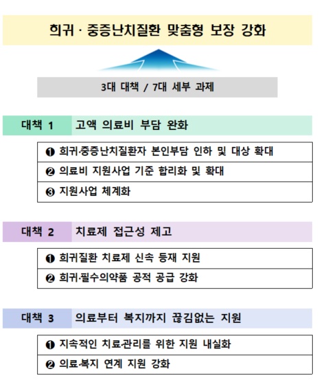 이러한 문제를 해결하기 위해, 당면과제인 의료비 부담, 치료제 접근성 문제를 조속히 완화하고 의료-복지가 연계된 혜택을 제공할 수 있도록근본적인 시스템 개선에 착수한다.