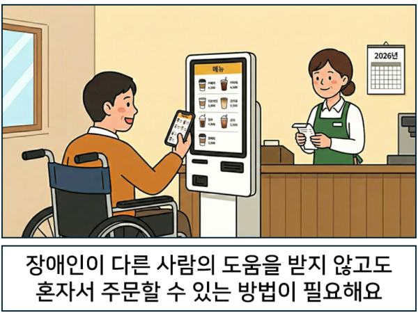 1. 2026년부터는 작은 가게들도 장애인이 쓰기 편한 *키오스크를 의무적으로 설치해야 했어요.