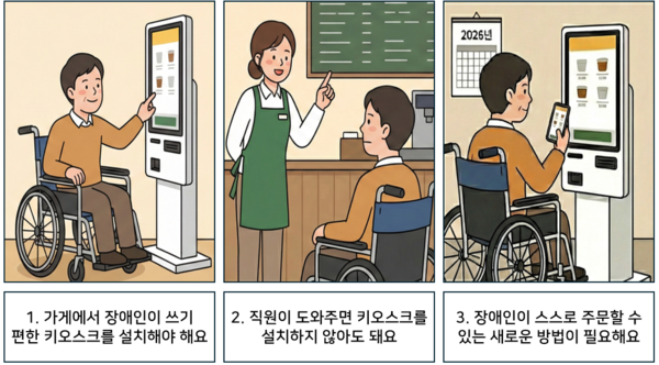 그래서 정부는 장애인도 쉽게 쓸 수 있는 키오스크를 설치하도록 법을 고쳤어요. 2026년 1월부터는 작은 가게들도 모두 장애인이 쓰기 편한 키오스크를 설치해야 했어요.