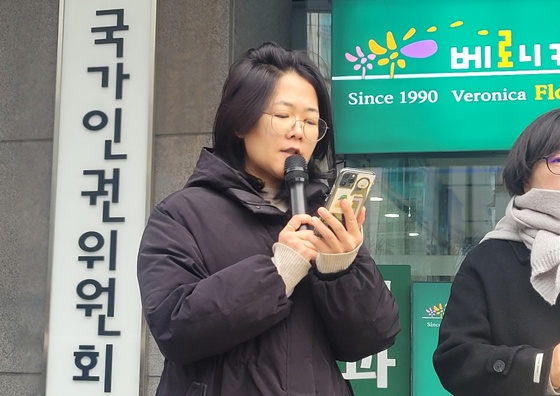 23일 국가인권위원회 앞에서 개최된 ‘장애인 등 특별한 교육지원이 필요한 아동과 청소년 교육권 차별 집단 진정’ 기자회견에서 발언하는 법조공익모임 나우 이수연 변호사. ©에이블뉴스