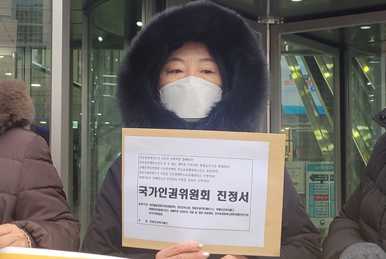 23일 국가인권위원회 앞에서 개최된 ‘장애인 등 특별한 교육지원이 필요한 아동과 청소년 교육권 차별 집단 진정’ 기자회견에서 진정서를 들고 있는 학부모 . ©에이블뉴스