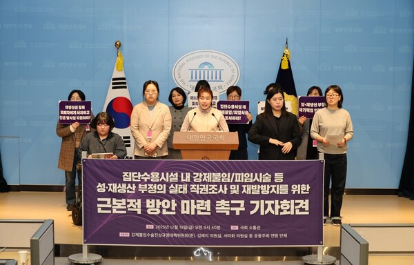 에이블뉴스 이슬기 기자】강제불임수술진상규명대책위원회(이하 대책위)와 김예지·서미화 의원이 19일 국회 소통관에서 기자회견을 갖고, 집단수용시설 등에서 행해진 장애여성 강제불임·피임시술 등 성·재생산 건강과 권리 침해 역사와 현황에 대한 실태 조사와 탈시설 등의 근본적 재발방지 방안을 촉구했다.