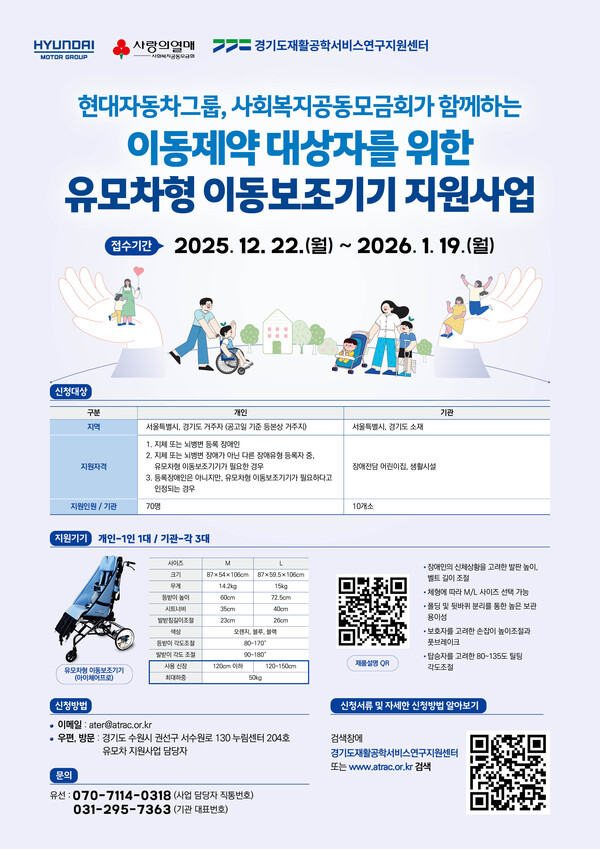【에이블뉴스 이슬기 기자】경기도재활공학서비스연구지원센터가 현대자동차그룹의 후원과 사회복지공동모금회의 지원을 받아 ‘이동제약 대상자를 위한 유모차형 이동보조기기 지원사업’을 추진한다고 22일 밝혔다.