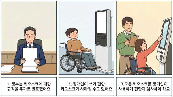 정부는 *디지털포용법의 자세한 규칙을 새로 추가했어요. 이 규칙에는 가게에서 쓰는 *키오스크에 대한 내용이 담겨 있어요. 원래 키오스크는 장애인도 혼자서 쉽게 사용할 수 있어야 해요. 하지만 정부는 가게에 장애인을 도와주는 직원이 있다면, 장애인을 위한 키오스크를 두지 않아도 된다는 규칙을 만들었어요.