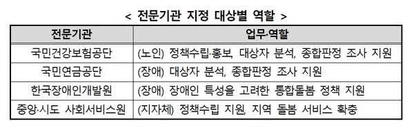 국민건강보험공단, 국민연금공단, 중앙 및 시·도 사회서비스원, 한국장애인개발원을 전문기관으로 지정한다.