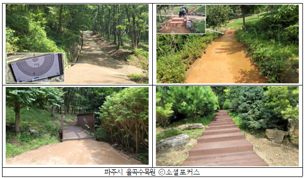 【에이블뉴스 이슬기 기자】경기도 파주시에 위치한 율곡수목원은 다양한 산림문화와 체험 프로그램을 제공하며 시민들의 여가·휴식 공간으로 활용되고 있지만, 일부 구간의 단차, 계단, 급경사로 인해 휠체어 이용자, 노약자, 유아차 이용자 등 이동약자의 접근이 제한되고 있는 것으로 나타났다.