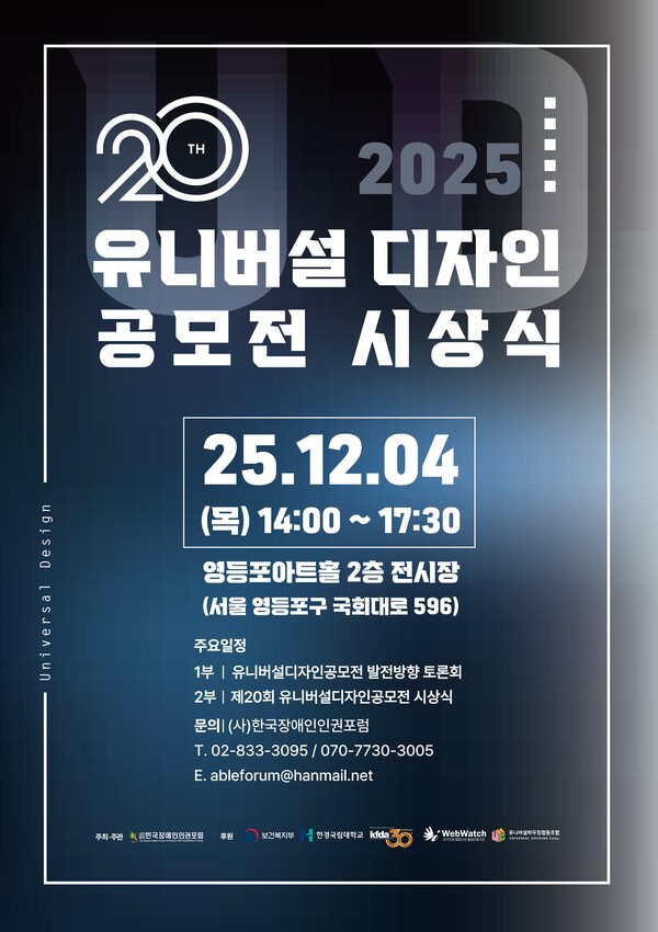 한편, ‘제20회 유니버설디자인공모전’ 시상식은 12월 4일 영등포아트홀에서 열리며, 수상작 전시는 시상식과 함께 진행될 예정이다.
