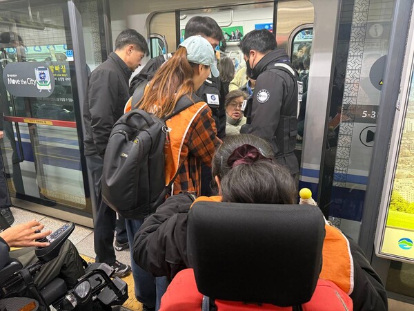 18일 오전 "장애인권리예산 보장"을 외치며 출근길 지하철 투쟁을 펼친 전국장애인차별철폐연대.ⓒ전국장애인차별철폐연대