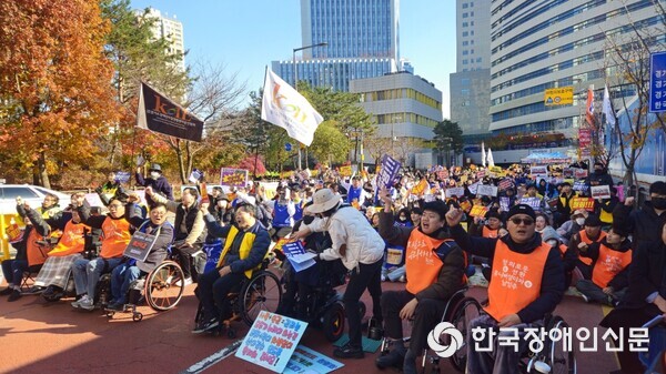 전성환 기자 : 사단법인 경기도장애인자립생활센터총연합회(대표 송기태, 이하 경자연)는 지난 11월 21일 경기도청 광교 신청사 앞에서 ‘경기도 장애인자립생활센터 지원예산 현실화 투쟁결의대회’를 개최했다.