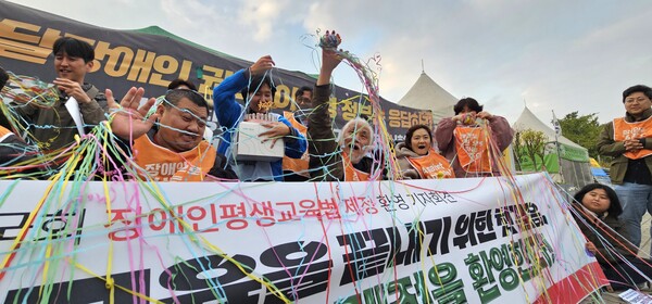 26일 국회 본회의 직후 장애인평생교육법 제정을 환영하는 전국장애인차별철폐연대.ⓒ전국장애인차별철폐연대