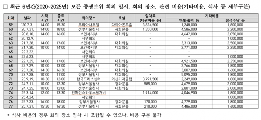 2023년, 서울시 중구 한국프레스센터 외신기자클럽에서 개최된 71차 회의의 경우 대관료는 380만 원이었다. 올해 3월에는 코스요리가 제공되는 한정식집 ‘컨퍼런스하우스 달개비’에서 74차 회의를 진행했는데, 대관료 191만 원 포함 총 776만 원을 지출했다.
