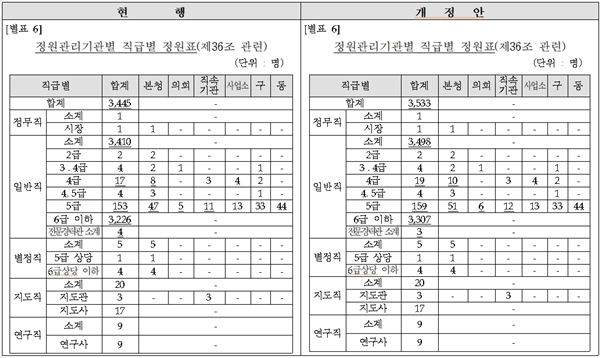 고양시가 지난 9일 입법예고한 ‘고양시 행정기구 및 정원 조례 일부개정조례안’에 따르면 시 본청은 3개국(局)이 신설(재난안전국·일자리경제국·주택건축국)되고 1개국은 폐지(도시혁신국)되며, 5개과(課)를 신설(본청: AI전략담당관·에너지정책과·구조물관리과·공공건축과 및 직속기관: 농업기술센터 동물정책과)하고 고양시의회에는 1개과가 신설된다. 이에 따라 정원 조정도 이뤄져 4급(국장) 2명, 5급(과장) 6명을 비롯해 6급 이하 81명 등 총 88명이 늘어나고 전문경력관 1명이 줄어든다.