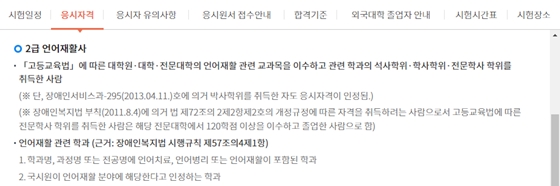 이전 장애인복지법은 ‘2급 언어재활사’ 국가시험 응시자격에 대해 ‘고등교육법에 따른 대학원·대학·전문대학의 언어재활 관련 교과목을 이수하고 관련 학과의 석사학위·학사학위·전문학사학위를 취득한 사람’이라고 명시하고 있었다.