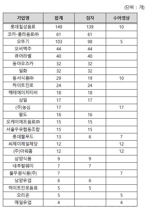 기업별로는 롯데칠성음료가 점자 139개, 수어영상 10개 등 총 149개로 가장 많았다. 이어 오뚜기(103개), 코카콜라(61개), 오비맥주(44개), 큐어라벨(40개), 동아오츠카·일화(32개), 동서식품(29개), 하이트진로(24개), 해태(18개), 상일·농심(17개) 순으로 집계됐다.