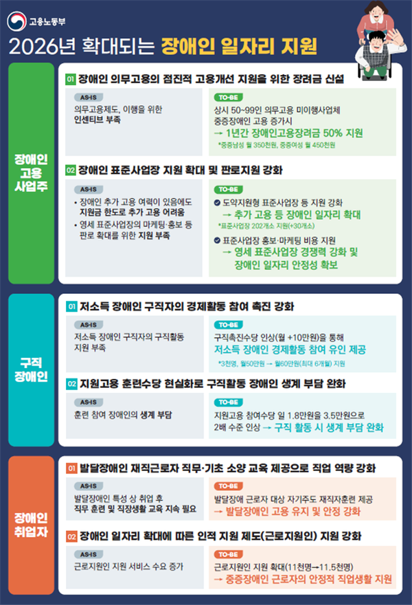 【에이블뉴스 이슬기 기자】내년 중증장애인 근로자의 안정적 직업재활을 지원할 근로지원인 지원이 1만1500명으로 확대된다. 의무고용미달사업체의 고용 확대시 인센티브를 지급하는 '장애인고용개선장려금'도 새롭게 신설될 예정이다.