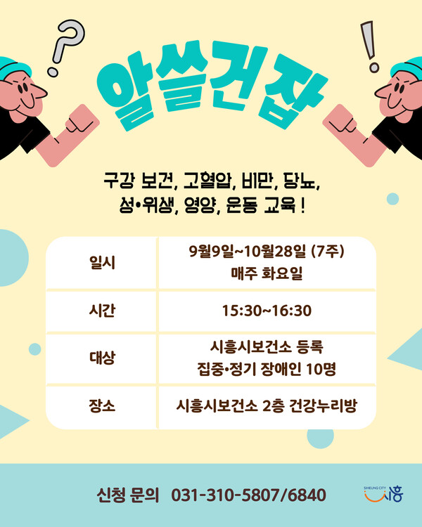 전성환 기자 : 시흥시(시장 임병택)는 오는 9월 9일부터 10월 28일까지 장애인의 건강관리 역량 강화를 위한 ‘알쓸건잡(알아두면 쓸모 있는 건강 잡학사전)’ 프로그램을 운영한다고 25일 밝혔다.
