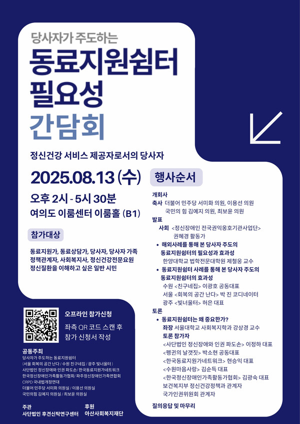 주최 측은 “동료지원쉼터는 정신장애인의 실질적 회복과 사회 참여를 위한 중요한 기반”이라며, “이번 토론회가 사회적 인식 개선과 정책적 진전을 이끄는 계기가 되기를 기대한다”고 밝혔다.